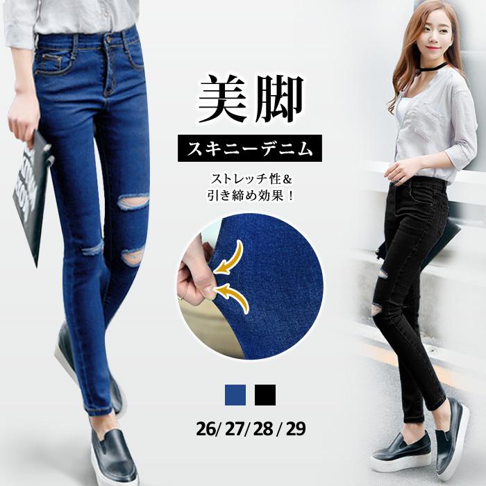 ダメージジーンズ レディース 春 夏 春夏 黒 スキニーパンツ クラッシュ ストレッチ デニム 美脚 パギンス ブラック ネイビー ボーイフレンドデニム 送料無料 T008 H Koei Store 通販 Yahoo ショッピング